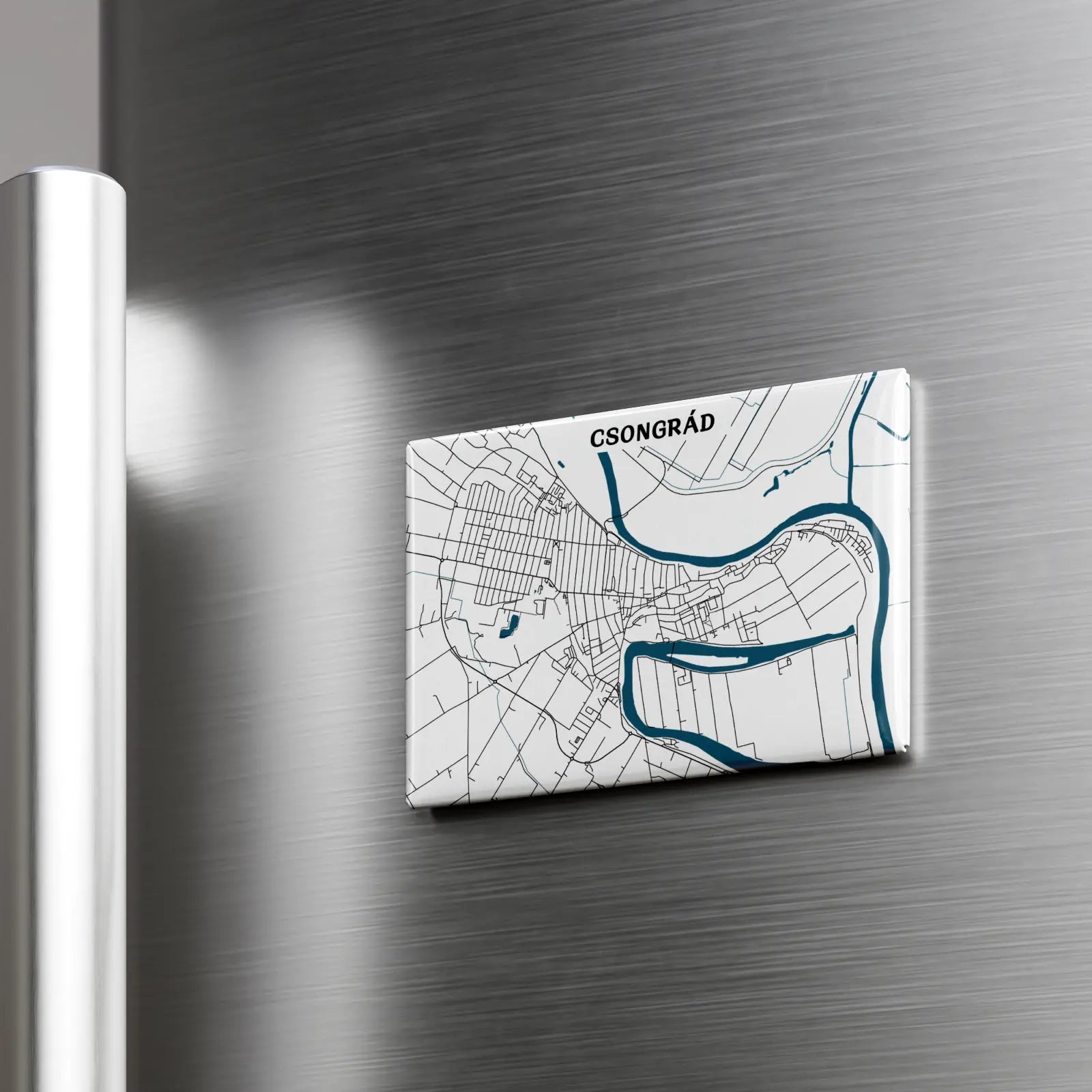 Ezen a prémium, 8x5,5cm méretű hűtőmágnesen Csongrád dizájn térképe kapott helyet, amelyen a város főbb útvonal hálózata elevenedik meg. A felhasznált nagyméretű mágnes garantáltan stabilan tartja a hűtőre vagy egyéb fém tárgyra elhelyezett fényképet, bevásárló listát, személyes üzeneteket.
