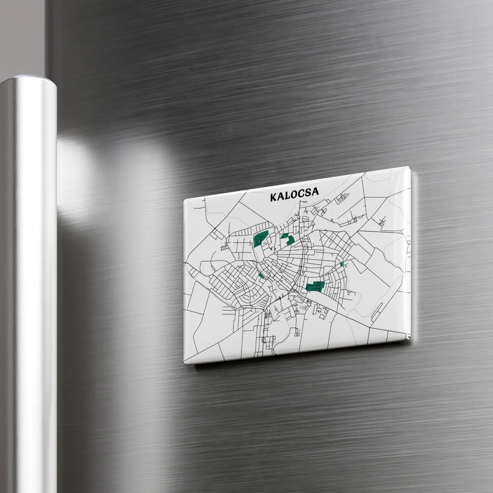 Ezen a prémium, 8x5,5cm méretű hűtőmágnesen Kalocsa dizájn térképe kapott helyet, amelyen a város főbb útvonal hálózata elevenedik meg. A felhasznált nagyméretű mágnes garantáltan stabilan tartja a hűtőre vagy egyéb fém tárgyra elhelyezett fényképet, bevásárló listát, személyes üzeneteket.