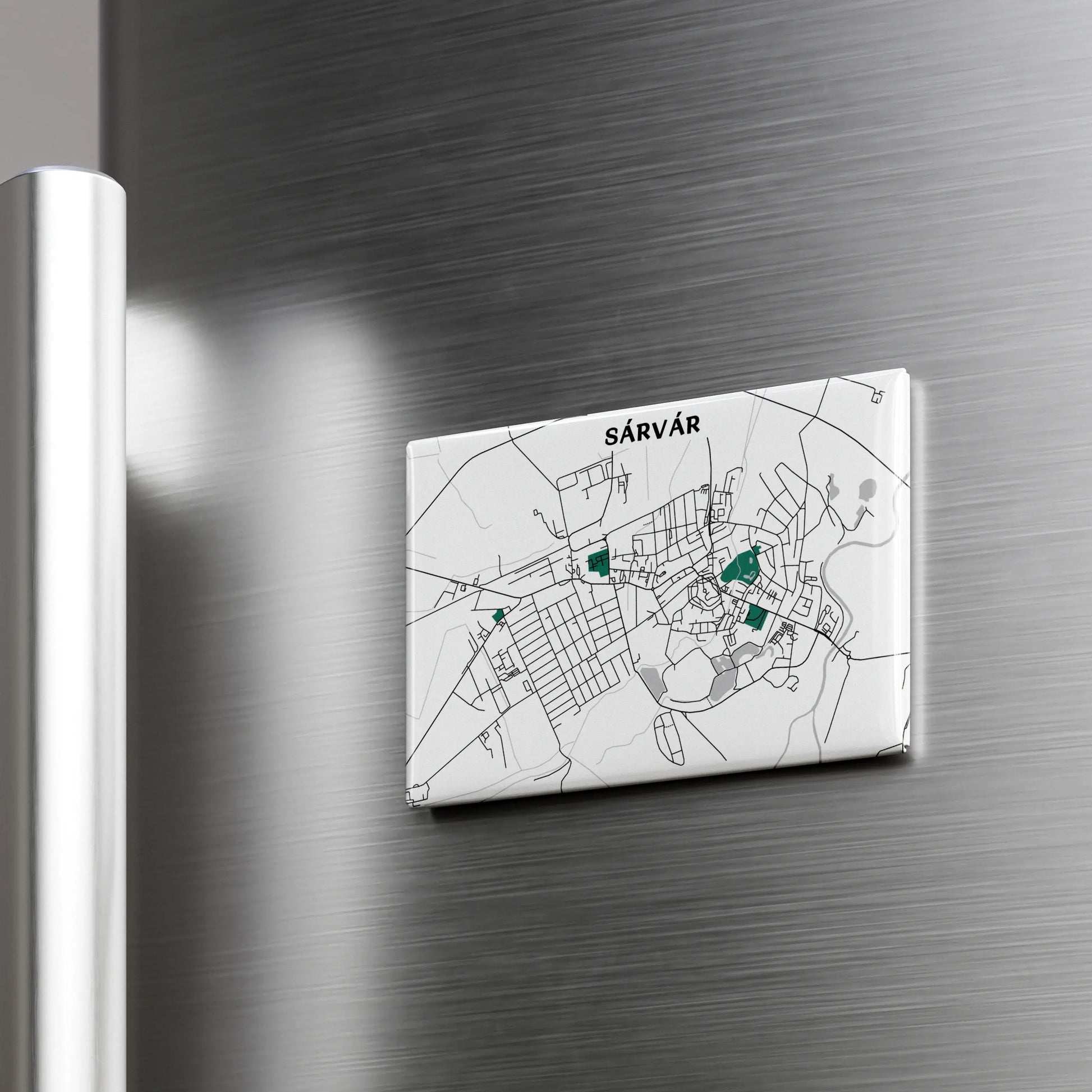 Ezen a prémium, 8x5,5cm méretű hűtőmágnesen Sárvár dizájn térképe kapott helyet, amelyen a város főbb útvonal hálózata elevenedik meg. A felhasznált nagyméretű mágnes garantáltan stabilan tartja a hűtőre vagy egyéb fém tárgyra elhelyezett fényképet, bevásárló listát, személyes üzeneteket.
